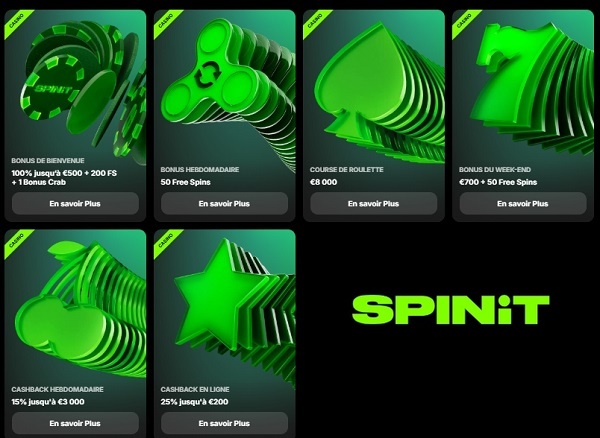 Vous cherchez les bonus de casinos en ligne les plus intéressants ? Voyons ce que propose Spinit au sein de sa page Promotion.