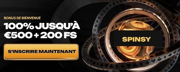 L’offre de bienvenue de Spinsy s’adresse à tous les nouveaux inscrits. Il s’agit d’un bonus de 100 % jusqu’à 500€, accompagné de 200 tours gratuits. Il suffit de la sélectionner à l’inscription, pour en bénéficier dès que votre premier dépôt sera effectué.